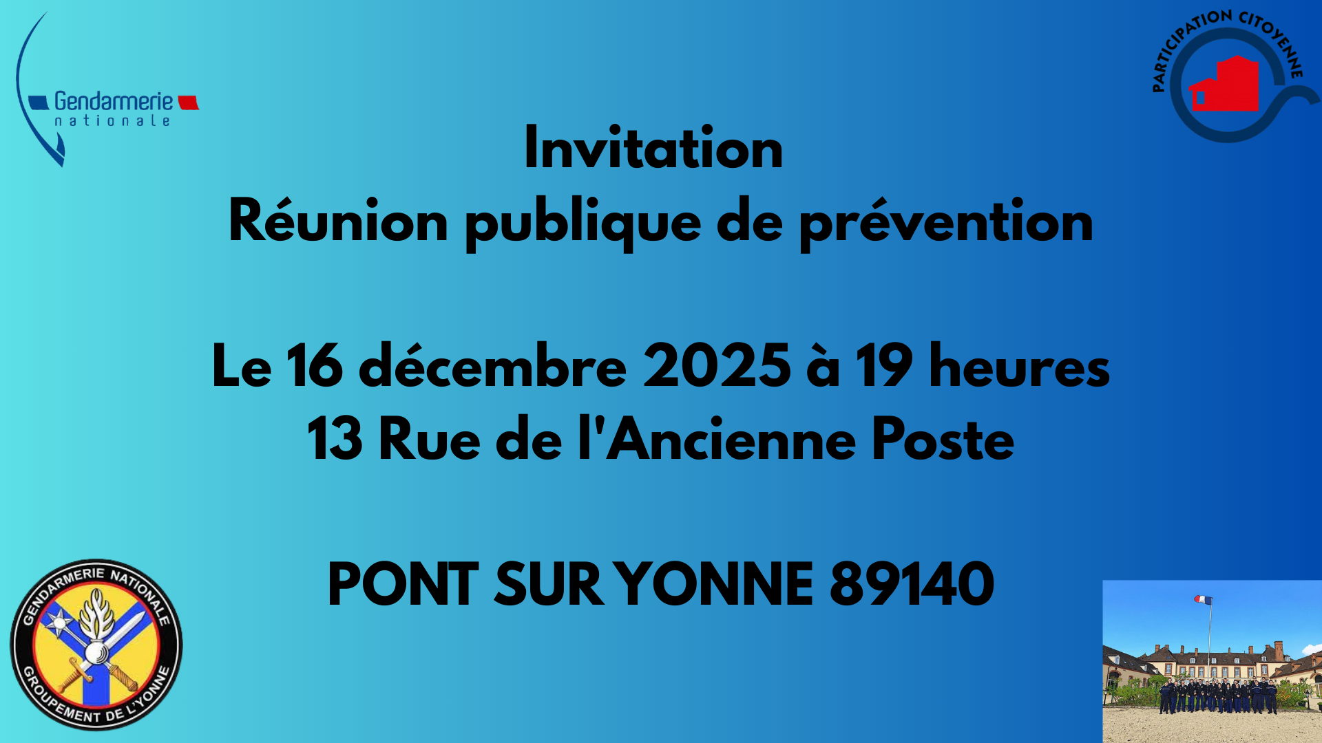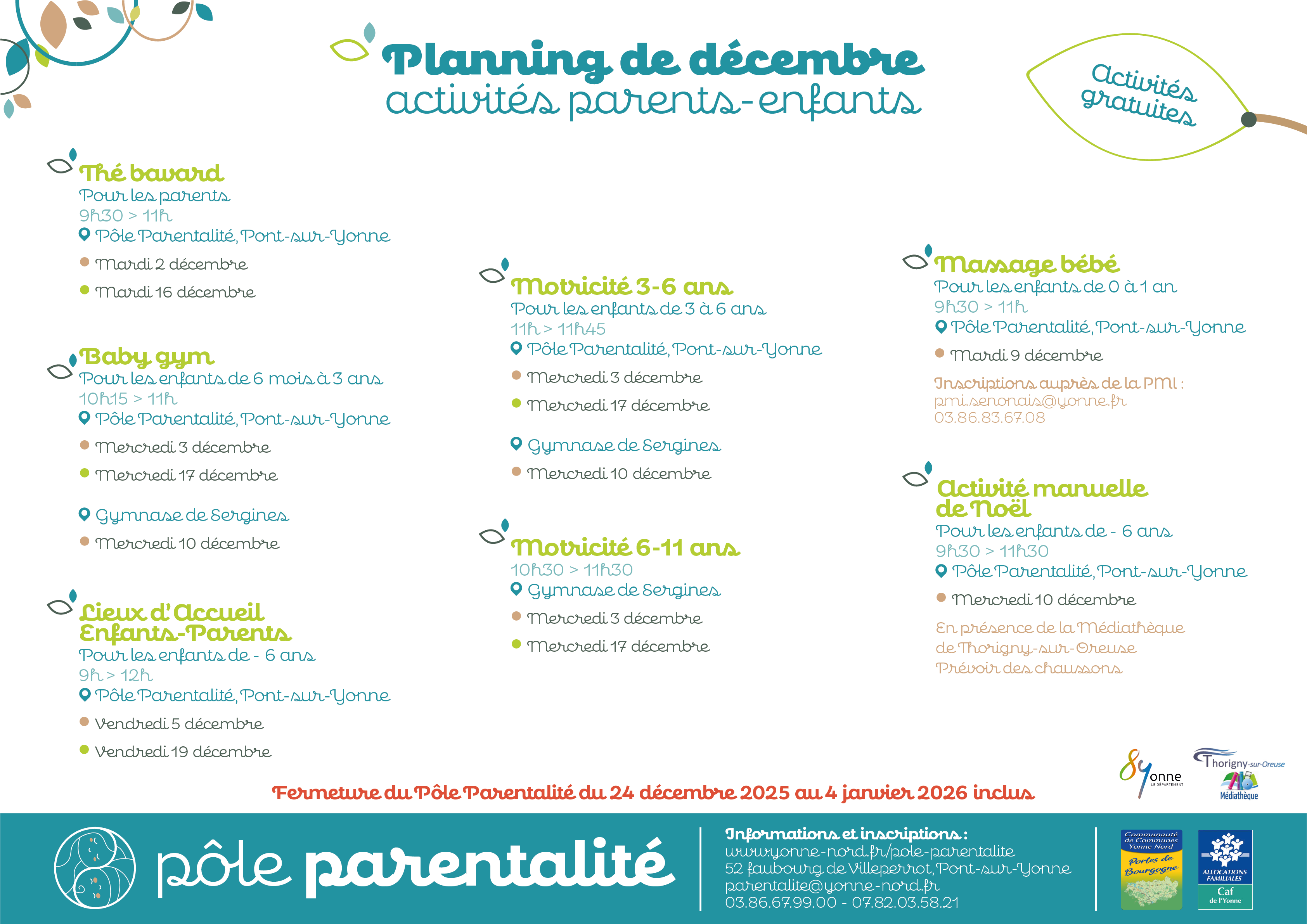 du moment Cliquez sur une image pour l'agrandir CR des Conseils municipauxVous pouvez accéder aux CR des CM des 30/09 et 19/11 et aux différentes délibérations en cliquant ici.Soyez vigilants envers les risques de cambriolages, etc.Cette réunion permettra d'informer les usagers sur les risques liés aux cambriolages, faux policiers et différentes arnaques. Thé bavard parentalAtelier décorations de NoëlPlanning décembre des activités Parents-Enfants Pôle parentalité Horaires car Vinneuf-Sens Via GisyLe petit journal en ligne est disponible.Bibliothèque.Vous pouvez consulter la nouvelle liste des livres disponibles à la bibliothèque. Prêt GRATUIT ! Ouverture le jeudi de 14 h à 17 h. Liste des livres.Planning Relais petite enfance COCCYNELLESInformations sécheresse dans l'Yonne. |